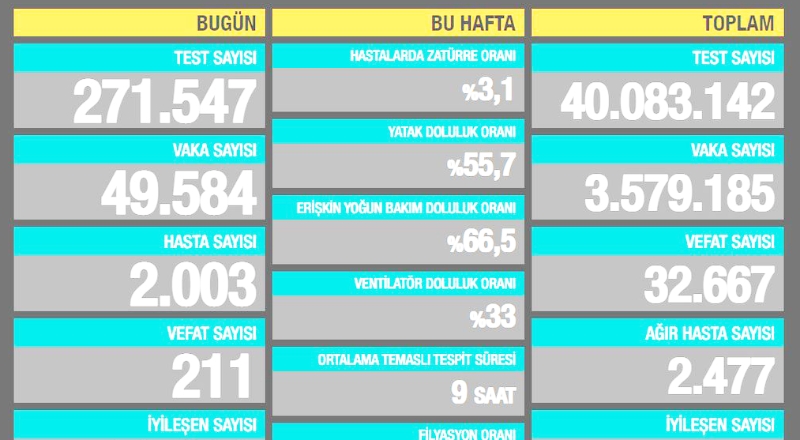 Buna göre Bakanlık, son 24 saatte 271.547 test yapıldığını, 49.584 kişiye Covid-19 tanısı konduğunu, bunlardan 2.003 kişinin Covid-19 hastası kabul edildiğini, 211 kişinin salgın nedeniyle hayatını kaybettiğini, 28.498 kişinin iyileştiğini, 2.477 Covid-19 hastasının durumunun ağır olduğunu açıkladı.