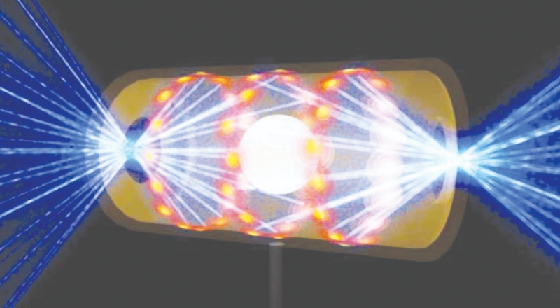 Lazerler, bu yakıtı kurşunun 100 katı yoğunluğunda sıkıştırıyor ve sıcaklığını güneşin merkezinden daha büyük bir sıcaklık olan 100 milyon dereceye çıkartıyor. Bu koşullar da termonüklear füzyonun başlamasına yardımcı oluyor.