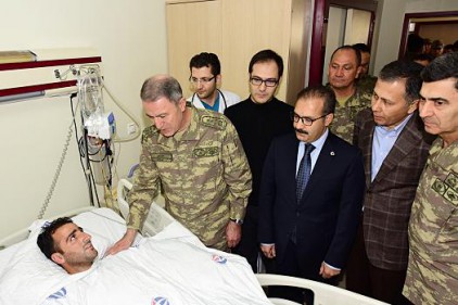 Genelkurmay Başkanı Orgeneral Hulusi Akar (solda), beraberinde Kara Kuvvetleri Komutanı Orgeneral Salih Zeki Çolak (sağda), 2. Ordu Komutanı Korgeneral İsmail Metin Temel ile, Fırat Kalkanı Harekatı'nda yaralanan ve Gaziantep Üniversitesi (GAÜN) Tıp Fakültesi Şahinbey Eğitim ve Araştırma Hastanesinde tedavi gören askerleri ziyaret etti. Ziyarette Gaziantep Valisi Ali Yerlikaya (sağ2), 5'inci Zırhlı Tugay Komutanı Tuğgeneral Ali Ekiyor ve GAÜN Rektörü Ali Gür (sağ3), diğer ilgililer de hazır bulundu.İHA