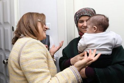 Fatma Şahin ve beraberindekiler 8 aylık bebekleri bulunun işitme engelli Adem ve Esra Karakuş çiftini de ziyaret ederek bebek sesi algılayıcısı ve ışıklı zil sistemi hediye etti.