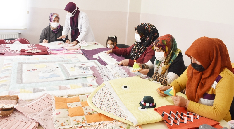 Şahinbey Belediyesi’ne ait Şehit Cevdet Özdemir Sosyal Tesisi’ndeki kurslara gelen kadınlar, evde kullanılmayan eski battaniye, CD, yırtık kumaşlar ve benzeri eşyaları değerlendirerek pike takımı, seccade, yastık kılıfı, eldiven gibi çeyizlik eşya yaparak hem aile ekonomilerine katkı sağlıyor hem de meslek öğreniyorlar.