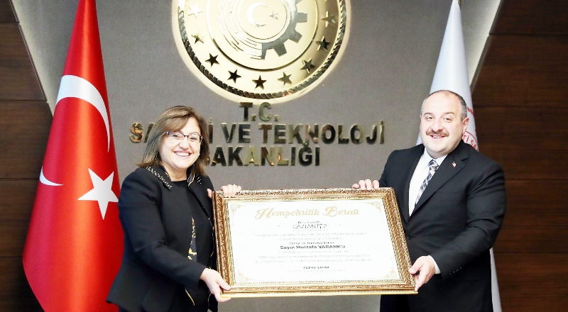 Gaziantep Büyükşehir Belediye Meclisi’nin Eylül Ayı Meclis Toplantısı’nda fahri hemşeri ilan edilen Sanayi ve Teknoloji Bakanı Mustafa Varank’a Büyükşehir Belediye Başkanı Fatma Şahin, Ankara ziyaretinde, Fahri Hemşerilik Payesi ve Beratı’nı verdi.