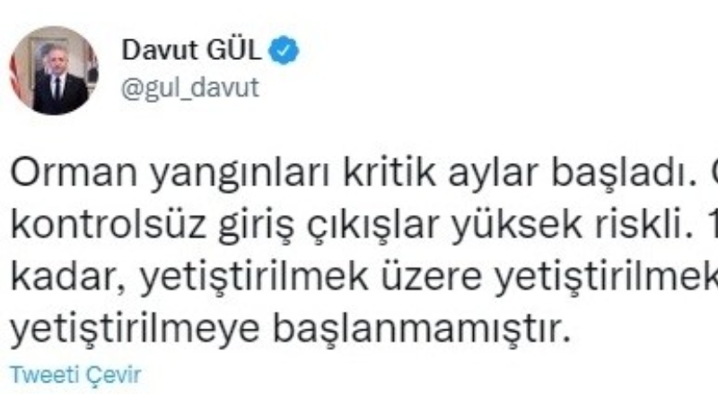 Gaziantep Büyükşehir Belediyesi, Valilik ve Orman İşletme Müdürlüğü iş birliğinde 180 orman köyüne yangınla mücadele ve önlemeye yönelik malzeme dağıtımının yapıldığı Gaziantep'te, Vali Davut Gül'den orman yangınlarına karşı kritik bir uyarı geldi. Vali Gül uyarıda bazı ormanlık alanlarda piknik yapmanın yasaklandığını duyurulurken, "Orman yangınları açısından kritik aylar başladı. Ormanlara kontrolsüz giriş çıkışlar yüksek risk oluşturuyor. 1 Ekim tarihine kadar, düzenli piknik alanlarının dışındaki orman alanlarına girmek, piknik yapmak yasaklanmıştır'' ifadelerine yer verildi.