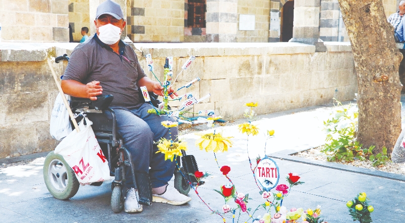 Gaziantep’te çocukken geçirdiği yüksek ateşli hastalık nedeniyle belden aşağısı felç olan 47 yaşındaki Yücel Ak, yaklaşık yarım asırdır tekerlekli sandalyeye bağlı halde yaşıyor. 18 yıl çalıştığı fabrikadan emekli olduktan sonra tekerlekli sandalyesiyle çalışmaya sokaklarda devam eden Ak, elleriyle süslediği tartısının başında her gün aynı yerde müşterilerini bekliyor.