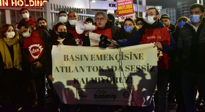 DİSK Basın-İş, dün akşam İhlas Haber Ajansı (İHA) muhabiri Ahmet Demir’e tokat atan gazeteci Muharrem Sarıkaya’yı protesto etmek için Habertürk’ün İstanbul Taksim’deki binası önündeydi.