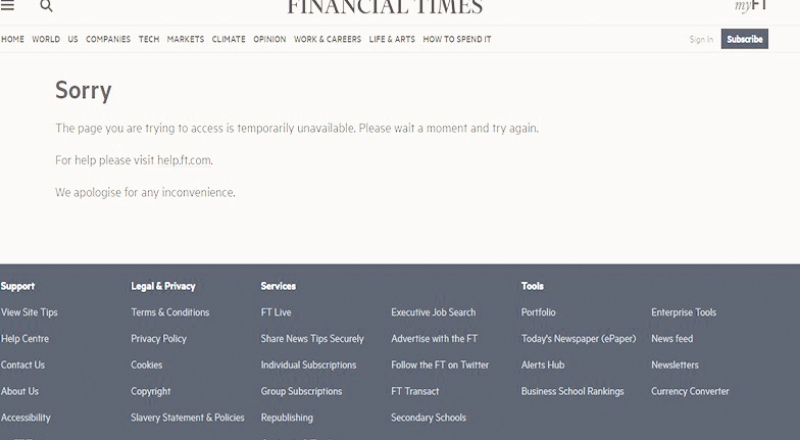 Financial Times, New York Times ve Bloomberg News dahil olmak üzere haber kuruluşları tarafından işletilen çok sayıda web sitesi bugün dünya genelinde çöktü.