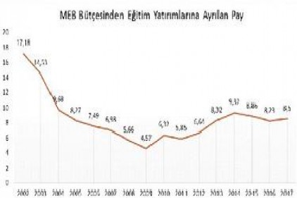 “2016 yılı itibariyle MEB bütçesinden eğitim yatırımlarına ayrılması düşünülen pay, hükümetin tam gün eğitim ve okul öncesi eğitimin zorunlu olacağı yönündeki iddialarına rağmen sadece binde 3’lük bir artışla yüzde 8,5 olmuştur.
