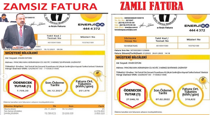 “AKP Hükümetinin bu zam politikası ekonomik anlamda domino etkisi yaratarak yine vatandaşımıza yüksek enflasyon, yoksulluk, işsizlik ve fakirlik olarak yansıyacaktır” diyen Yılmazkaya, “Gaziantep’te bir esnaf kardeşimiz bir ay önce elektriğe 7 bin lira öderken, AKP’nin yeni yıl zamlarıyla şimdi 27 bin lira ödüyor! Esnafın elektrik faturası kiradan yüksek geliyor! Anlaşılan o ki sizin amacınız zar zor ayakta durmaya çalışan esnafı batırmak” dedi.