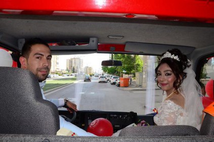 Gaziantep Büyükşehir Belediyesi İtfaiye Daire Başkanlığında itfaiye eri olarak çalışan Betül Ağar ve Osman Bozoğlan, Gaziantep'te düzenlenen merasim ile dünya evine girdi. İtfaiyeci çiftin mesai arkadaşları, sürpriz yaparak, gelin arabası olarak itfaiye aracını süsledi. Yangına gider gibi sirenleri açık bir şekilde şehir turu atan çift, düğün salonuna da itfaiye aracıyla geldi. Davetlilerin şaşkın bakışları arasında araçtan inen çift, alkışlarla karşılandı.