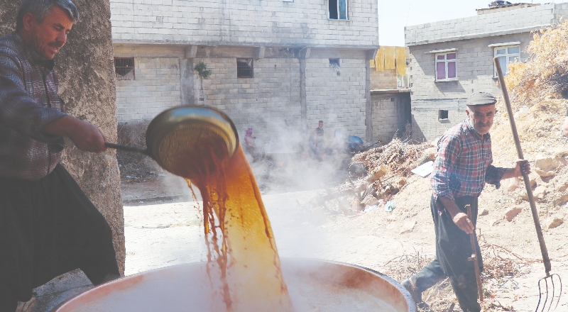 Gaziantep’te çiftçilerin emek harcadığı üzüm bağları hasadın başlamasıyla birlikte toplanan üzümler, köy evlerinde sal diye adlandırılan havuzlarda ezilerek suyu çıkarılıyor. Dev kazanlara konularak saatlerce ateşte kaynayan üzüm suyu, meşakkatli bir emeğin sonucunda üzüm pekmezine dönüştürülüyor.