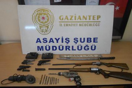 Öte yandan, M.A.D. isimli şüphelinin ikametinde yapılan aramada, 5 adet kuru sıkıdan çevirme tabanca, 2 adet av tüfeği, 10 adet 7.65 mm çapında fişek, 4 adet kuru sıkı fişek, 11 adet değişik çaplarda matkap ucu, 1 adet spiral makinesi, 1 adet kılıç ele geçirildi.İHA