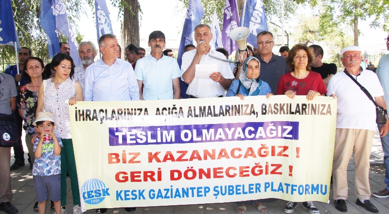 KESK Dönem Sözcüsü Ömer Parlakçı, konuşmasını şu cümlelerle bitirdi: “Kamu görevinden çıkarılarak anayasal ve uluslararası sözleşmeler ile güvence altına alınmış çalışma hakkı gasp edildi. İhraç edilenlerin çalıştırılmaması için işverenler el altından tehdit edilmiş, geçen haftalarda ihraç edilenlere iş bulması için yardım edenlerin gözaltına alınmasıyla aşiret devletlerinde görülebilecek, hukuk ile izah edilemeyecek bir aşamaya varıldı. Komisyon ve idare mahkemeleri eliyle süreci uzatma bir şeyi değiştirmeyecek. KESK’liler dün olduğu gibi bugün de iktidar politikalarına biat etmeyecek, boyun eğmeyecek. Askıya çıkardıkları ekmekleri almayacak, ellerinden aldıkları ekmeğin mücadelesini verecekler. Açlıkla terbiye etme politikaları karşılık bulmayacak.” Ali Göksular