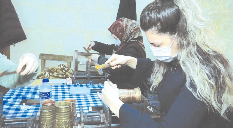 Gaziantep’te kadınlar, Bakırcılar ve Sedefçiler Odası ile İş-Kur işbirliği ile düzenlenen sedef ve bakır kurslarına katılarak hem zamanlarını değerlendiriyor hem de meslek sahibi oluyor. Bazı kadınlar ise kursta adeta rehabilite oluyor. Kursiyerlerden Zeynep Kabak, kursa gelmeden önce ellerinde ağrı ve kist olduğunu söyleyerek, kursa başladıktan sonra bu hastalıktan kurtulduğunu ifade etti. Kursu bitirdikten sonra kendi iş yerini kurabileceğini de belirten Zeynep Kabak, “Burada bakır öğrenmeye geldim. Arkadaşlarım, komşularım herkes bana yapamazsın dediler. Ama geldim, yaptım, başardım. Bunu da ilerletmeyi istiyorum, severek yapıyorum. Ellerim rahatsızdı, yapamazsın, çekiç tutamazsın dediler, kaleme tutamazsın dediler. Ama ellerime çok iyi geldi. Böyle bir terapi gibi ellerimi kullanabiliyorum şu anda. Önce evde kullanamıyordum ellerimi, rahatsızdı ellerim. Ama geldim severek yapıyorum, devam ettirmek isterim. İlerleyen zamanlarda bir iş yeri açmayı, küçük bir yerde olsa arkadaşlarımla devam ettirmek isterim. Bir elimde ağrı hastalığı vardı kemiklerimden dolayı, diğer elimde de kist vardı, ameliyat dedi doktor ve benim kist hastalığım bile gitti. Şu anda elimde ağrı hastalığım var ama öyle rahatsız değilim. Çekici tuttuğum zaman ağrı filan hissetmiyorum. Evde sıkılıyorum, cumartesi, pazar evdeyiz, ama burayı istiyorum, geleyim, bakır yapayım. Yani zevkli, severek yapıyorum, güzel bir iş, güzel bir meslek” dedi.