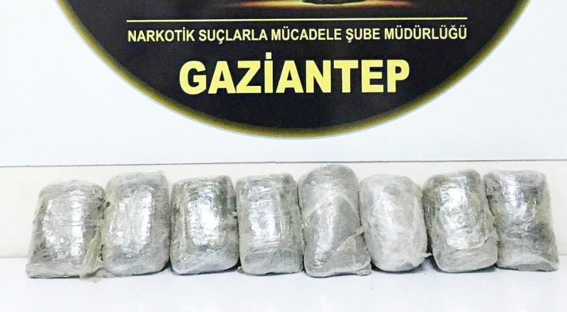 Gaziantep İl Emniyet Müdürlüğüne bağlı Narkotik Suçlarla Mücadele Şube Müdürlüğü ekipleri uyuşturucu madde satışının önlenmesine yönelik yaptığı çalışmalar kapsamında kentin doğu gişelerinde durdukları bir kamyonda arama yaptı. Yapılan aramada aracın taban kısmına gizlenmiş halde birer kiloluk paketler halinde toplam 8 kilo uyuşturucu metamfetamin maddesi ele geçirildi.