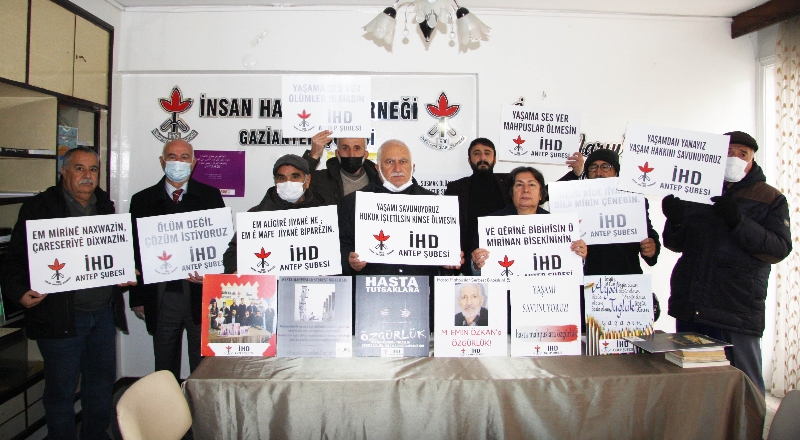 “Adli Tıp Kurumu raporlarının ve kolluktan gelecek raporların hazırlanma sürecinin hayli uzun sürmesi durumu ağır olan, bir gün dahi cezaevinde tutulmaması gereken mahpusların ölüme terk edilmesi anlamına geliyor” diyen İnsan Hakları Derneği Gaziantep Şube Başkanı Av. Sinan Taştekin, konuşmasını şu şekilde sonlandırdı: “AİHM hükümete de tutukluluk koşullarıyla ilgili düzenlemelerde her türlü insani önlemi almaları gerektiği önerisinde bulunmuş ve ATK’nın yeniden yapılandırılarak prosedürlerin basitleştirilmesi gerekliliği noktasında uyarılarda bulundu. Ancak Türkiye’de yargı organları AİHM’in vermiş olduğu bu karardan sonra da Anayasa’nın 90. maddesi gereği bir iç hukuk normu haline gelen uluslararası sözleşmelere uymamakta, soruna ne insani ve vicdani ne de hukuki açıdan bakmaktadırlar. Türkiye’nin de imzaladığı uluslararası birçok sözleşmede hastalar ve hasta mahpuslar için düzenlemeler mevcut olup Türkiye mahkeme ve idari organlarının bu düzenlemelere uyması bir zorunluluk. Bu nedenle hasta mahpuslar için merhamet, insaf ya da lütuf değil adalet talep ediyoruz.” Ali Göksular