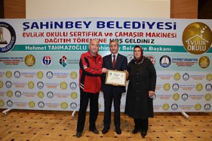 Şahinbey Belediyesi tarafından düzenlenen Evlilik Okulundaki eğitimlere katılan evli ve yeni evlenen 160 çift düzenlenen törenle sertifikalarını ve çamaşır makinelerini aldı.