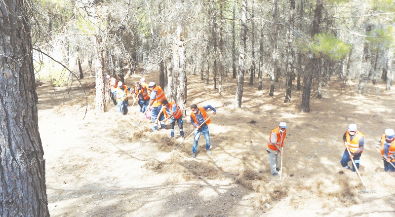 Yangın esnasında ateşlerin yayılmasını artıracak kozalaklar bir bir toplanıyor, yol kenarları temizleniyor.