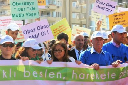 Gaziantep Festival Parkta başlayan etkinlikte yürüyüş öncesi vatandaşlara Büyükşehir Belediyesi tarafından 'obeziteye dur de' yazılı tişört dağıtıldı. Davullu zurnalı başlayan etkinliğe katılan vatandaşlar halay çekti.