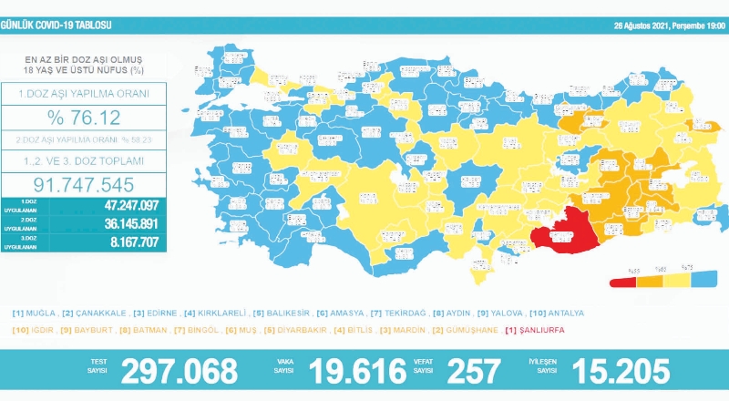 Tabloya göre, Türkiye'de son 24 saatte 297 bin 68 COVID-19 testi yapıldı 19 bin 616 kişinin testi pozitif çıktı, 257 kişi hayatını kaybetti.