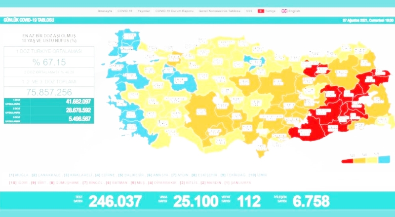 Tabloya göre, Türkiye'de son 24 saatte 246 bin 37 COVID-19 testi yapıldı 25 bin 100 vaka kişinin testi pozitif çıktı, 112 kişi hayatını kaybetti.