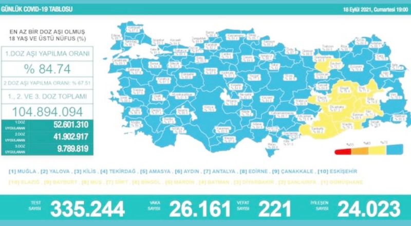 18 yaş üstü nüfusa göre birinci doz Türkiye ortalaması yüzde 84.74, ikinci doz ortalaması yüzde 67.24 oldu.