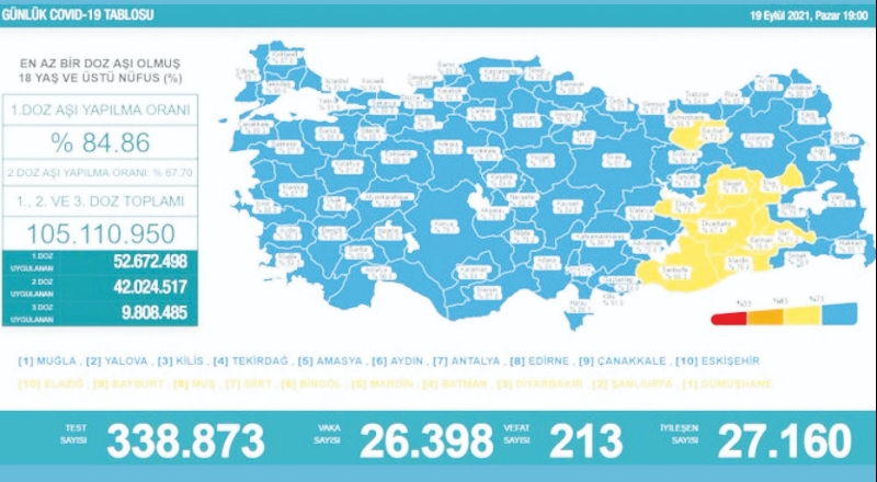 18 yaş üstü nüfusa göre birinci doz Türkiye ortalaması yüzde 84.86, ikinci doz ortalaması yüzde 67.70 oldu.