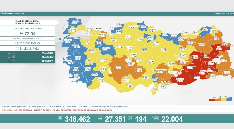 Türkiye'de bugüne kadar, 54 milyon 38 bin 516birinci doz, 45 milyon 23 bin 309 ikinci doz, 10 milyon 481 bin 25 üçüncü doz aşı uygulandı.