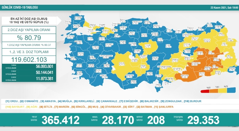 18 yaş üstü nüfusa göre birinci doz Türkiye ortalaması yüzde 90,37, ikinci doz ortalaması yüzde 80.79 oldu.