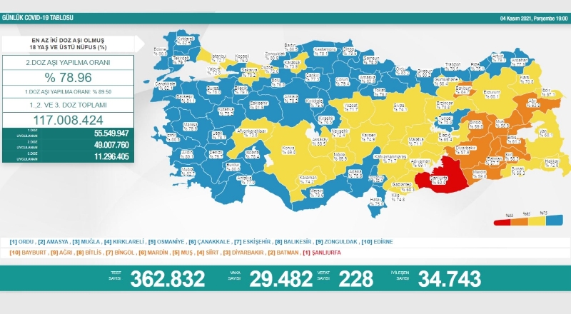 Tabloya göre, Türkiye'de son 24 saatte 362 bin 832 COVID-19 testi yapıldı. 29 bin 482 kişinin testi pozitif çıktı, 228 kişi vefat etti.