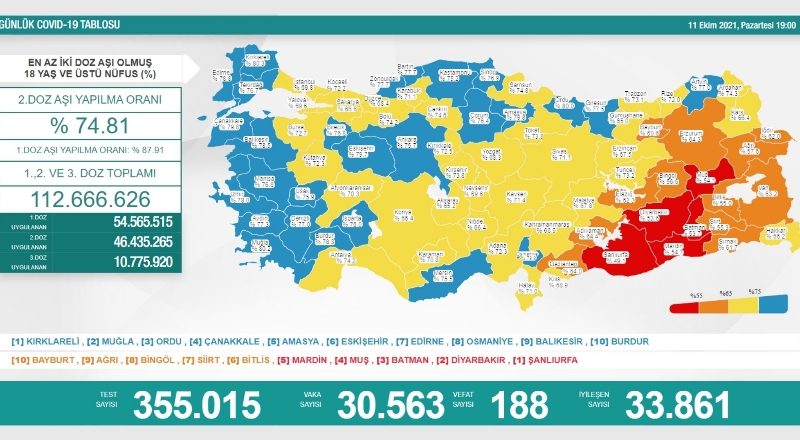 Tabloya göre, Türkiye'de son 24 saatte 355 bin 15 COVID-19 testi yapıldı. 30 bin 563 kişinin testi pozitif çıktı, 188 kişi vefat etti.