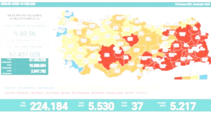 Tabloya göre Türkiye'de son 24 saatte 224 bin 184 COVID-19 testi yapıldı, 5 bin 530 işinin testi pozitif çıktı, 59 kişi hayatını kaybetti. İyileşen kişi sayısı ise 5 bin 217 oldu.