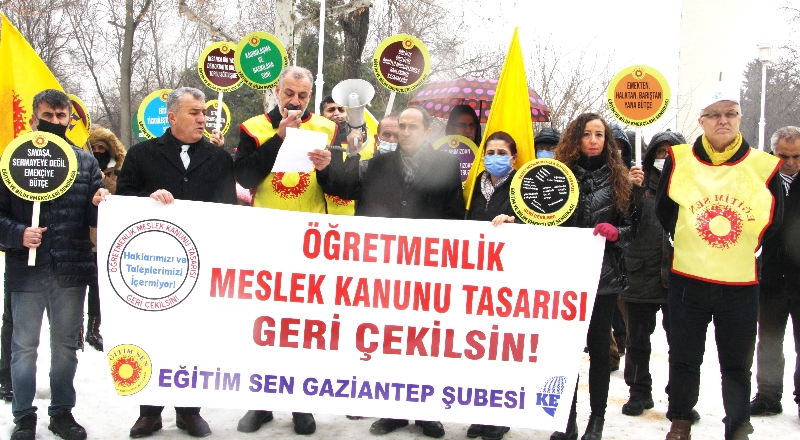 Eğitim Sen Gaziantep Şube Başkanı Ömer Parlakçı, konuşmasını şöyle tamamladı: “Aday öğretmenlere yönelik adaylık sınavının kaldırılması bir müjde olarak sunulurken, sınavın işlevinin Adaylık Değerlendirme Komisyonu’na devredilmesi, aday öğretmenlerin iş güvencesine yönelik büyük bir tehdit anlamını taşıyor. Bu düzenleme ile atamalarda yoğun olarak gündeme gelen mülakat-torpil uygulamalarının yeniden gündeme gelmesi, arşiv taraması ve güvenlik soruşturması gibi uygulamalar üzerinden yeni mağduriyetlerin ortaya çıkması kaçınılmaz olacak. Öğretmenlik Meslek Kanunu Tasarısı ile ilgili olarak, eğitim alanında örgütlü bütün sendikalara, sendikalı ya da sendikasız tüm eğitim emekçilerine ortak tepki göstermek adına çağrıda bulunuyoruz. Bugün bizleri farklı statüler üzerinden bölmek isteyenlere karşı birlikte hareket etmezsek, hiçbir meslektaşımızın onaylamadığı bu düzenlemeyi geri çektiremezsek, yarın daha büyük saldırıların hedefi olmamız kaçınılmaz olacak.” Adem Kesenek