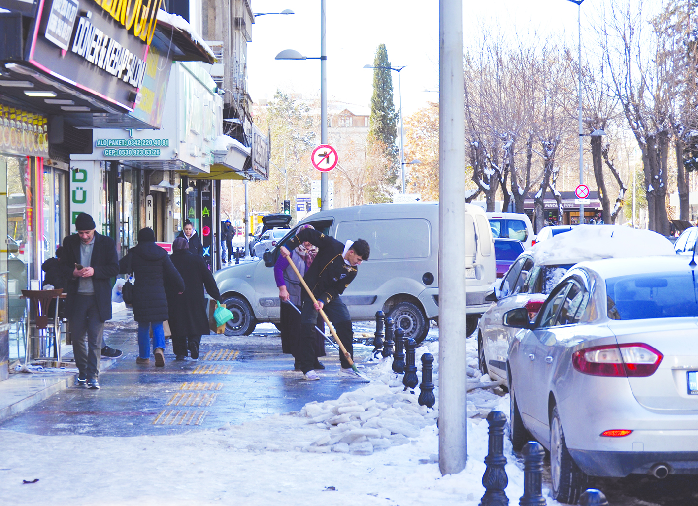 Belediye ekipleri kaldırımları, esnaf dükkanının önünü vatandaş ise evinin önünü karlardan temizlemeye devam ediyor. Hatta sürücüler bile araçlarının etrafındaki karları temizlemek için yoğun bir çaba gösteriyor.