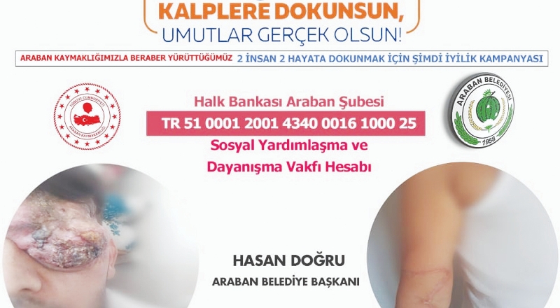 Araban Kaymakamı Mutlu'nun "2 İnsan 2 Hayata Dokunmak İçin Şimdi İyilik Zamanı’’ isimli yardım kampanyasına ilişkin Belediye Başkanı Hasan Doğru, sosyal medya hesabı üzerinden yaptığı yazılı açıklamayla kampanyaya desteğini duyurdu. Başkan Doğru destek duyurusunda bulunarak, ’’Araban Kaymakamlığımızla yürüttüğümüz kampanyaya personellerimizle birlikte 20 bin TL destek sağladık. Bu konuda duyarlı vatandaşlarımızdan destek bekliyoruz’’ ifadelerini kullandı.