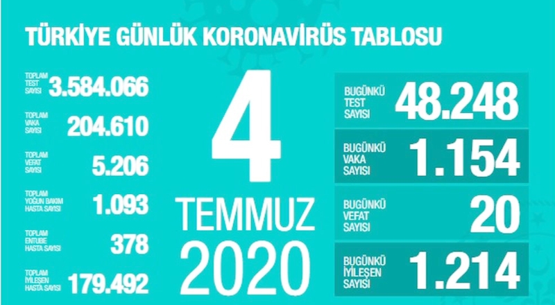 Türkiye'nin günlük Coronavirus tablosuna göre bugün 1.154 yeni Covid-19 tanısı konuldu. Bugün 20 kişi ise Coronavirus nedeniyle hayatını kaybetti. İyileşen hasta sayısı ise 1.214 oldu,