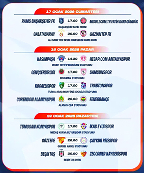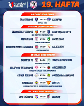 Ligin 19. haftasının açılışında Trabzonspor, Kasımpaşa'yı konuk edecek. Galatasaray, deplasmanda Fatih Karagümrük'le karşılaşırken Fenerbahçe evinde Göztepe'yi ağırlayacak. Haftanın kapanışında ise Beşiktaş, deplasmanda Eyüpspor'la karşı karşıya gelecek.