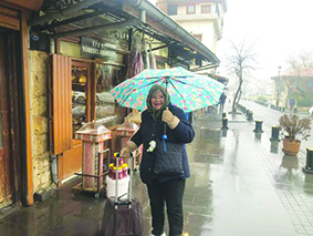 Benim tekerlekli pek güzel bir çantam var. Aldığım malzemelerin epeyi kısmını ona koydum. Sığmayanları Sevgili kocam elinde taşıdı. Derken yolda, tam kalenin önünde daha önce tanıdığı bir esnafa rastladı. Adamla pek hoş konuştular yağmur altında. Hala o güzel sokaklar bomboştu. Adam, “Abla bak, ne güzel memleket burası, acık bizi unutmayın, gelin” dedi. Söz verdim arada geleceğim.