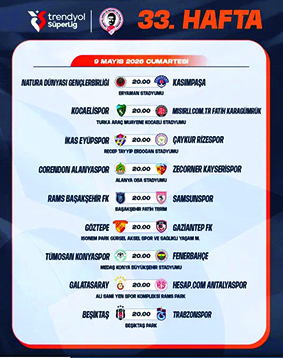33. haftada tüm maçlar 9 Mayıs Cumartesi günü oynanacak. Tüm karşılaşmalar saat 20.00'de başlayacak.