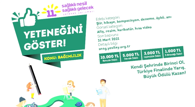 Yeşilay’ın genç nesillerde bağımlılıklara ilişkin farkındalık oluşturmak ve onları yeteneklerini keşfetmeye teşvik etmek amacıyla düzenlediği Sağlıklı Nesil Sağlıklı Gelecek Yetenek Yarışması’nın 11’incisi için başvurular başladı. Milli Eğitim Bakanlığı (MEB) iş birliğiyle düzenlenen yarışmaya; ilkokul, ortaokul ve lise öğrencileri edebi ve görsel olmak üzere iki ayrı kategorideki eserleriyle katılabiliyor. Edebi kategoride kompozisyon, şiir, öykü, deneme ve anı; görsel kategoride afiş, resim, karikatür ve kısa video alanlarında üretilmiş bağımlılık konulu eserler yarışıyor.